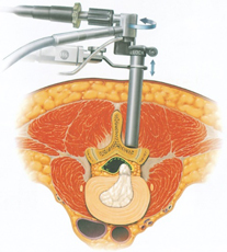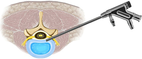 FESS法は、MED法で用いた直径16mmのtubular retractorを直径さらに低侵襲にした手術です。直径7~10mmのtubular retractorを用いて手術を行います。水を還流し良好な視野を保ちながら手術を行います。FESS法のために開発された小さな鉗子・ラジオ波バイポーラ・ドリルを用いて経皮的にヘルニアを摘出し、神経を圧迫する靭帯や骨を切除する方法です。現在、椎間板ヘルニアや腰部脊柱管狭窄症、頚椎症性神経根症などの頚椎病変の一部まで適応があります。