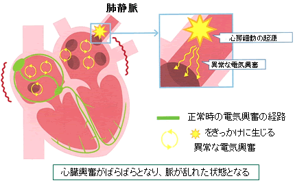 心房細動発生には、心房のある場所からの繰り返しの単発の不整脈(期外収縮)発生が関与していることが知られています。単発の不整脈の発生場所として、最も頻度が高い場所が肺静脈という血管であることがわかっております。