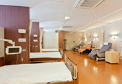 ベッド数は16床で、西側には大きな窓があり、窓からは光が差し、緑の木々が立ち並ぶ様子や、四季折々の景色を眺めることができます。一方、薄明かりのもと、ゆったりと治療時間を過ごすスペースもあります。
