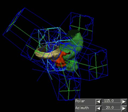 左図:治療計画です。膀胱(黄色)、直腸(緑色)を可能なかぎり避けるようにして、前立腺(赤色)への照射方向を決定しています。