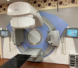 また、当院では画像誘導放射線治療(Image Guide Radio Therapy:IGRT)を実施しています。IGRTとは、治療前に治療部位のCT画像(コーンビームCT)を撮影することにより、位置のずれ量を求めて寝台を移動させ、mm単位で正確な位置決めを行う高精度放射線治療技術です。この位置照合装置としてELEKTA社製HexaPOD evoというカウチトップ監視システムと6軸補正機能付きの治療寝台を用いて高精度の治療を行っております。