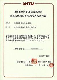 放射線治療の品質を担保する為、公益財団法人医用原子力技術振興財団が実施する治療用照射装置の第三者出力線量評価を受けています。