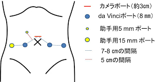 - トロカーと言われる筒状の管を計6本下腹部に挿入します。