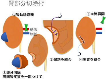 - がんに周囲の正常腎臓組織を付けて、切り取ります。