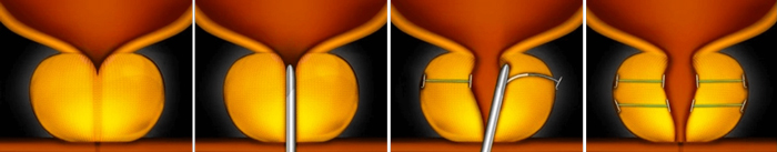肥大した前立腺組織を持ち上げて固定し、小型のインプラントを永久的に留置して尿道を拡張します。デリバリーシステムから出る小さな針を通して、インプラントが