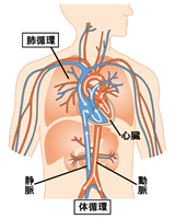肺循環:心臓と肺のあいだをめぐる血液循環です。肺で酸素を取り入れ、二酸化炭素を放出します。
