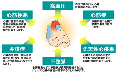心臓が本来の仕事をできず、体が要求する血液を送り出せないときや、体に血液が滞ってしまうことによって起こります。心不全は高齢者に多い病気の一つで、様々な心臓疾患が重症の状態になった時に起こってきます。いわば心不全は心臓が疲れた状態とも言えます。