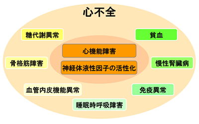 外来でお話を伺って、いくつか検査をするだけで心不全かどうかを判定することができます。心不全は心臓だけの病気ではなく全身にさまざまな異常を引き起こす全身の病気と考えられています。