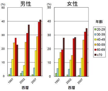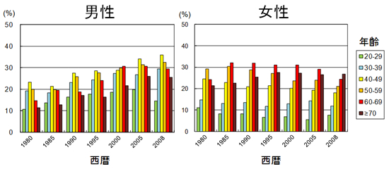 一方、喫煙している方は啓蒙活動によって減少傾向にあります。しかしながら、2009年には男性で38.2%、女性で10.9%とまだまだ高く、若年女性でむしろ増加しているという報告もあり注意が必要です。