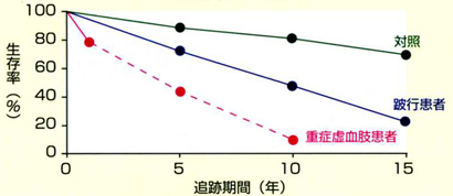 Fontaine分類のI、II度が間欠性跛行肢(かんけつせいはこうし)、III、Ⅳ度が重症虚血肢です。Ⅰ、Ⅱ度であれば切断が必要になる可能性は5年後で約5%程度ですが、III、Ⅳ度になると約6か月後には40%近い方に切断する必要性が出てきます。