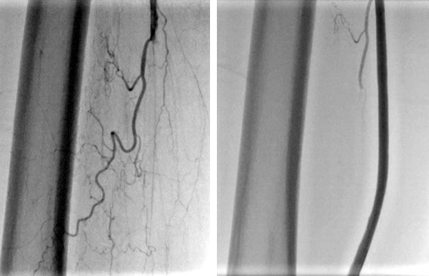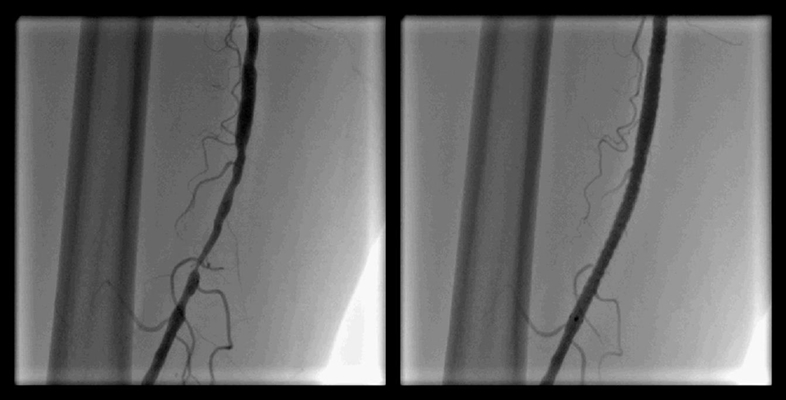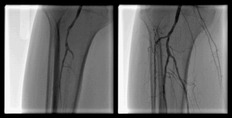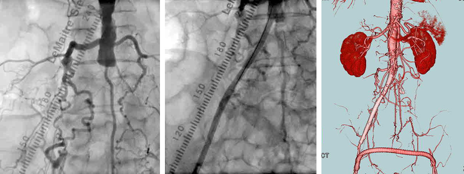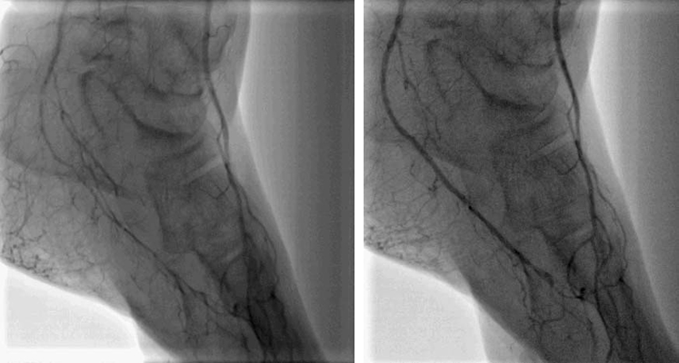 考え方としては、早期であるほど2の血管内手術のみで治る可能性が高いと考えてよいでしょう。現在の末梢動脈に対する血管内手術の適応は、大動脈・腸骨動脈領域から膝下動脈、さらに足関節から足趾にまで及びます。しかし、それぞれの治療法には当然ながら適応があります。このためしばしば従来からの手術との組み合わせであるハイブリッド手術が必要になりますが、血管内呪術の関与する割合は8~9割にも及んでいます。