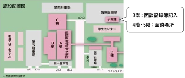 研究棟 TEL:0287-46-5418(9:00~17:30)面談場所は研究棟4階または5階の応接室となります。空き枠がない場合は同じフロアーの面談スペース(個室ではなくパーテションで区切られたスペース)となります。