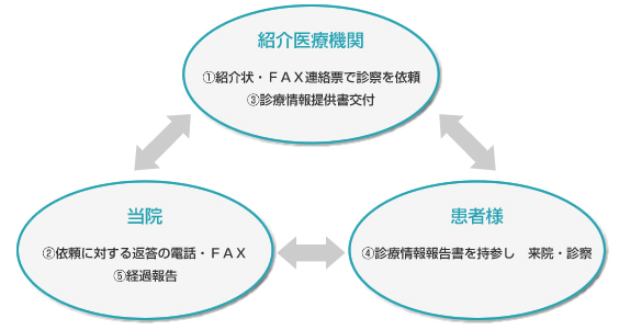 当院では、地域の医療機関の皆様の窓口となる地域医療連携室において、ご紹介いただいた患者様の検査予約や診療情報提供書(紹介状)に関する事務をより円滑に行うとともに、当院の医師および診療体制等の情報提供を迅速に行うことで、連携の充実化をめざしてまいります。