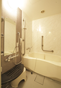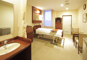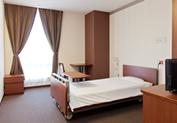 患者様のさまざまなご要望にお応えするために、スタンダードな4人部屋をはじめとして、個室、応接室付の特別室など、11タイプの病室がございます。室内には木目調の温かみのあるインテリアを配し、酸素配管などの医療設備をコンソールに内蔵しめだたせない工夫をするなど、くつろいだ気持ちでご療養いただくための環境づくりも大切にしています。