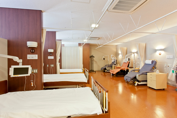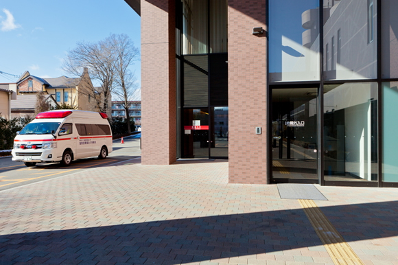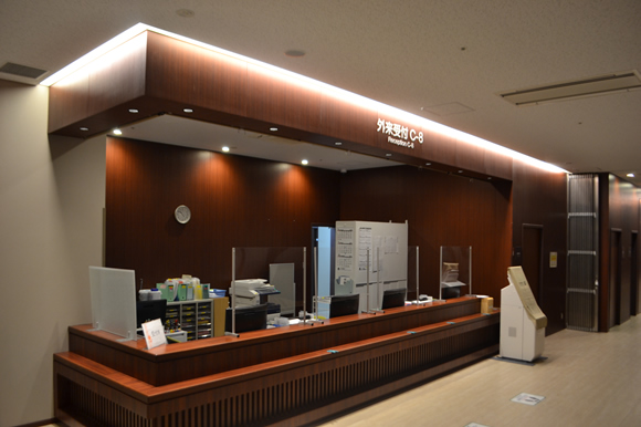 | 1F | ■受付⑤ ■外来診察室、 □一般内科、 □心療内科、 ■救急外来、 ■救急治療室、 ■地域医療連携室、 ■医療相談室(MSW)、 ■外来化学療法室、 ■時間外受付、 ■時間外お薬お渡し口、 ■時間外出入り口 ★A棟・C棟への連絡通路 |